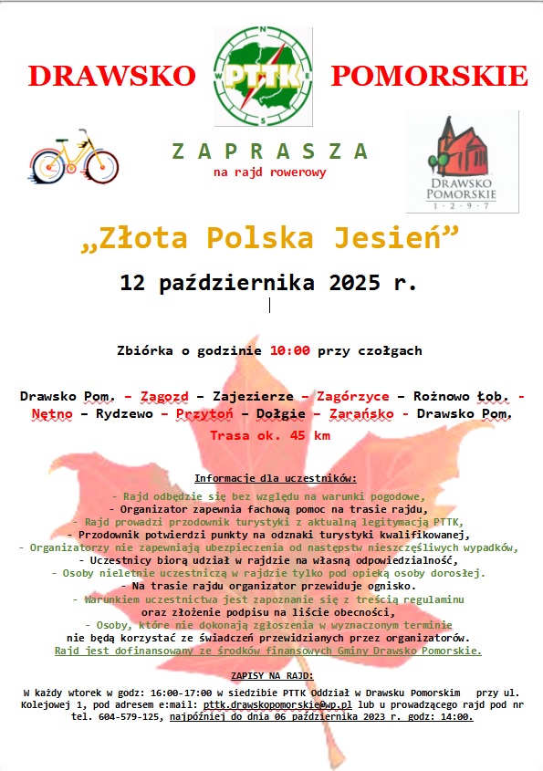 Już w najbliższą niedzielę 12 października zapraszamy wszystkich chętnych na rajd rowerowy Złota Polska Jesień. Przed nami do pokonania piękna trasa o długości ok 45 km przez najatrakcyjniejsze obszary gminy Drawsko Pomorskie. Zbiórka o godz. 10:00 jak zwykle przy czołgach. Szczegóły na plakacie.